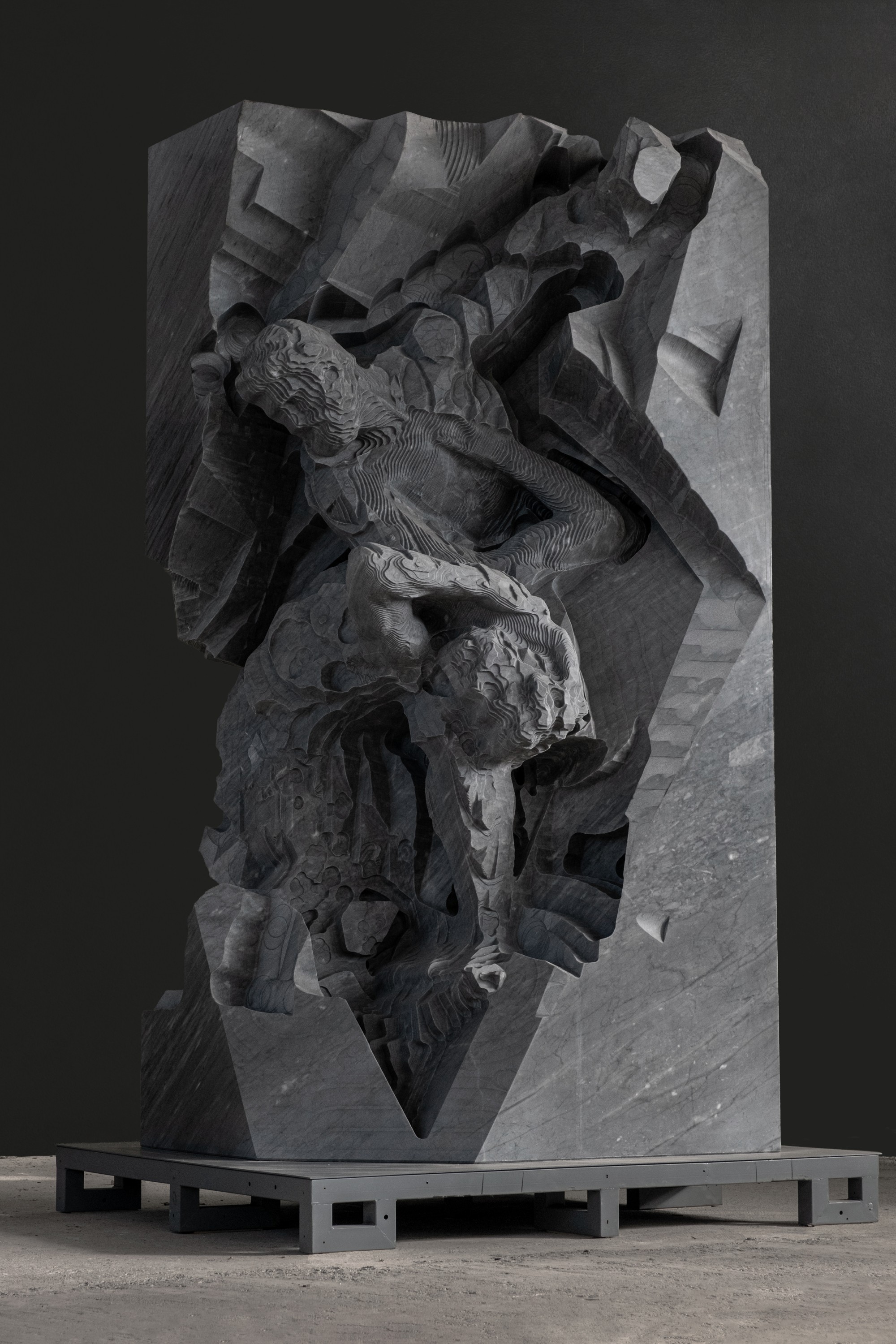 Unfinished sculpture variation of Giambologna’s masterpiece Hercules and Nessus carved out of marble via algorithmic-robotic means. The sculpture, left unfinished, documents the computational process, celebrating algorithmic aesthetics and new robotic sets of computational gestures.