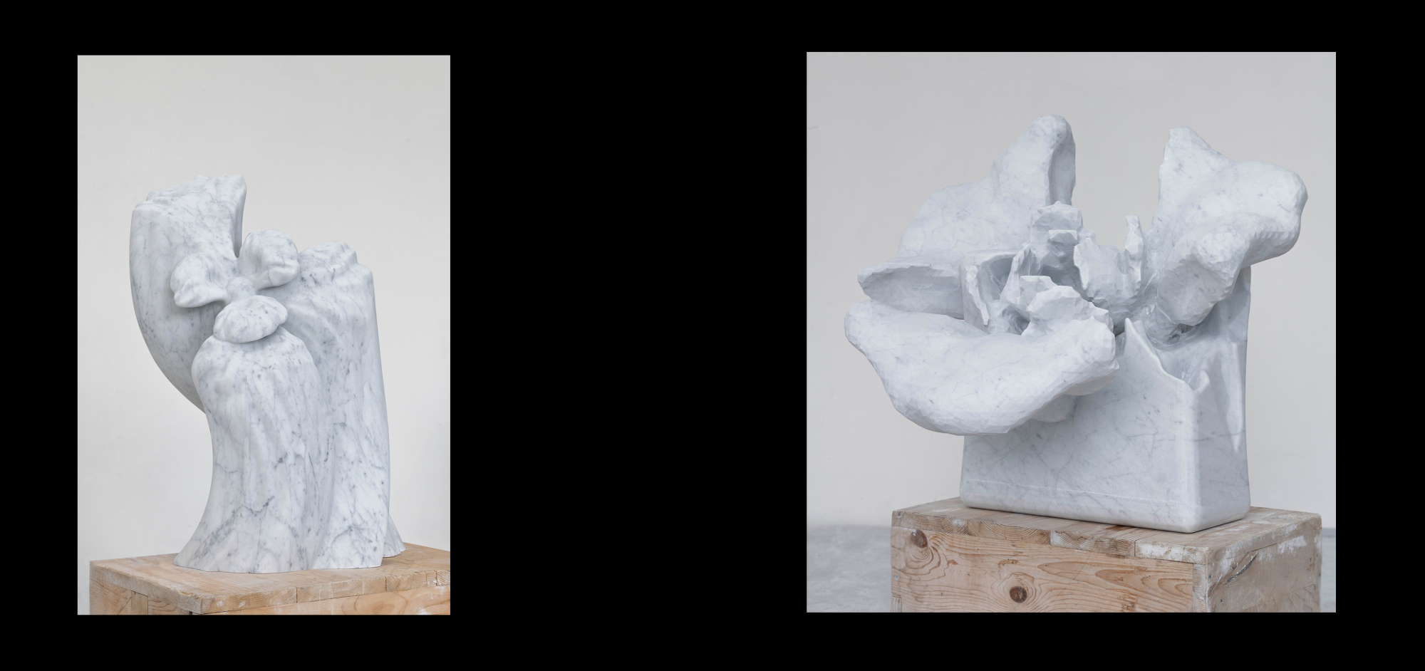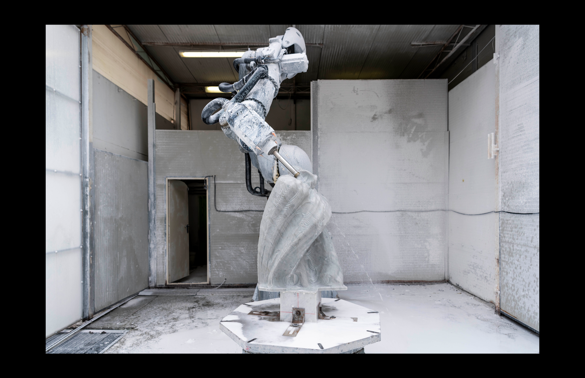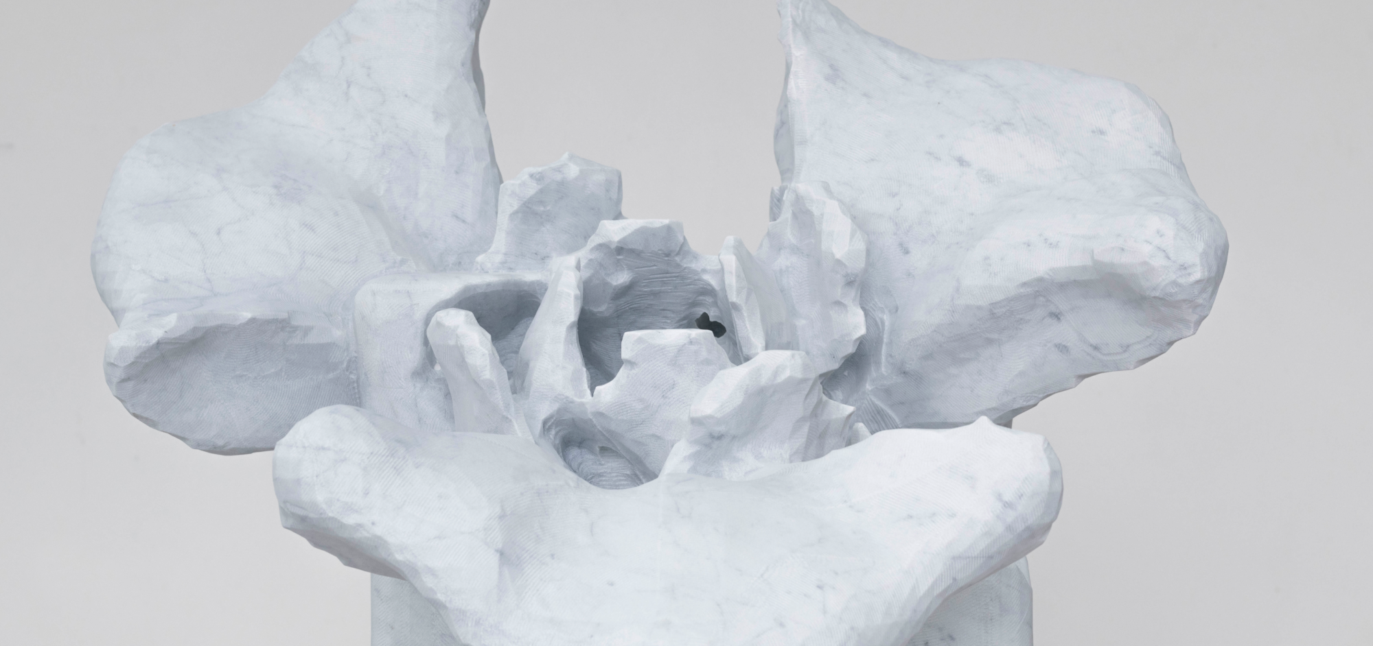 Glitching While Blooming explores the dialogue between human hand, machine, and marble. Robotic tools create irregularities, which the artist shapes into unique surfaces of geometry and texture. The work embraces imperfection, letting process guide the final form.