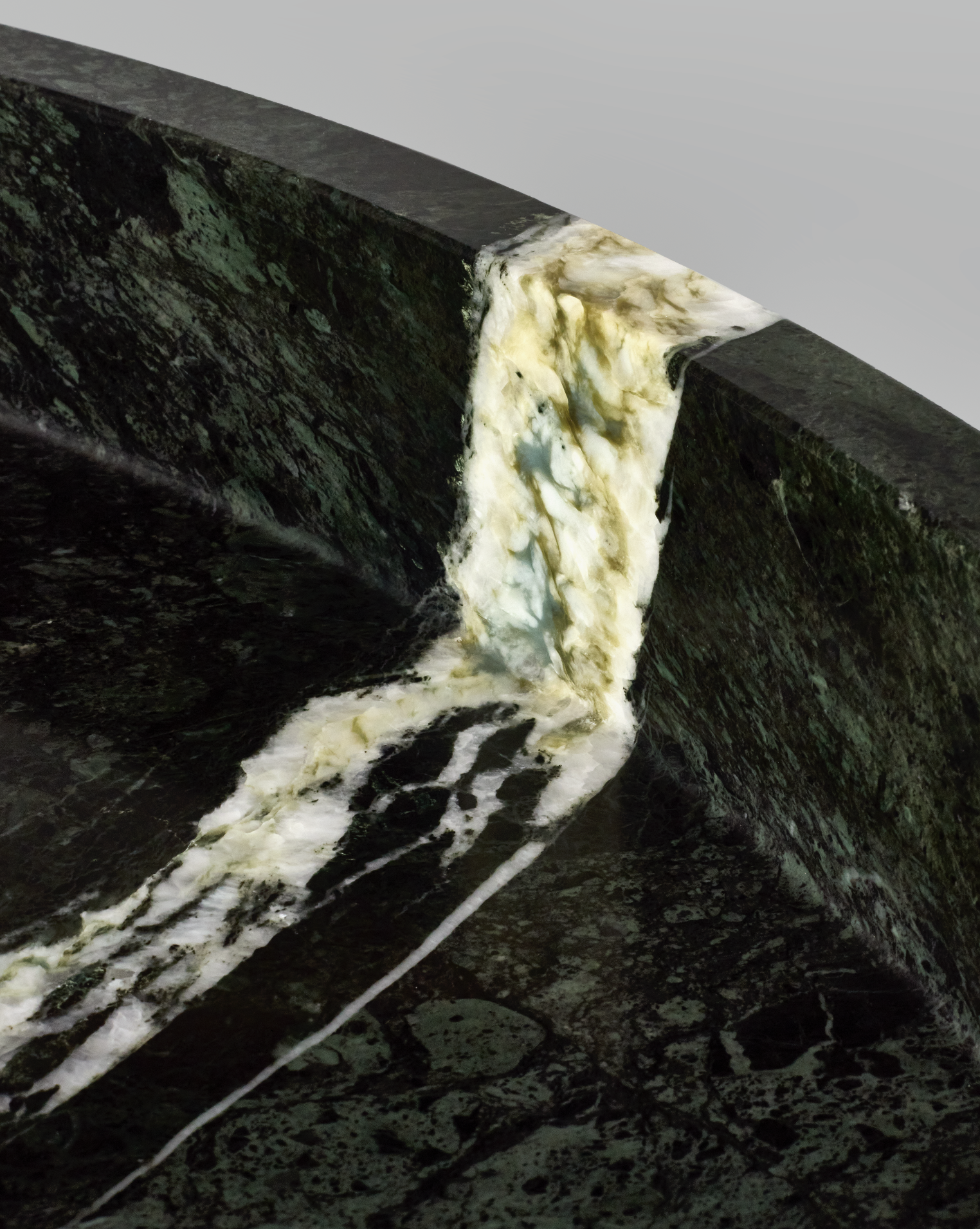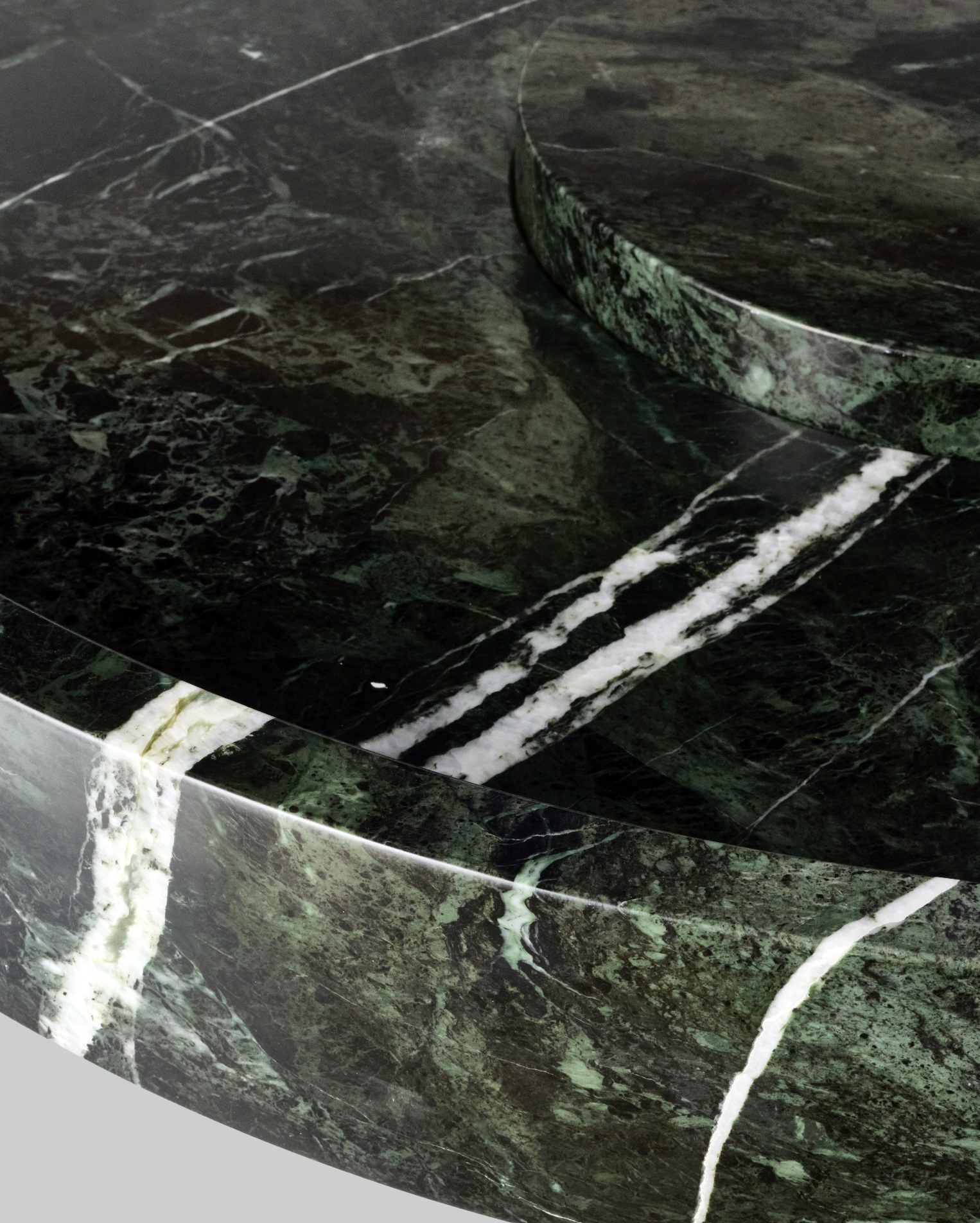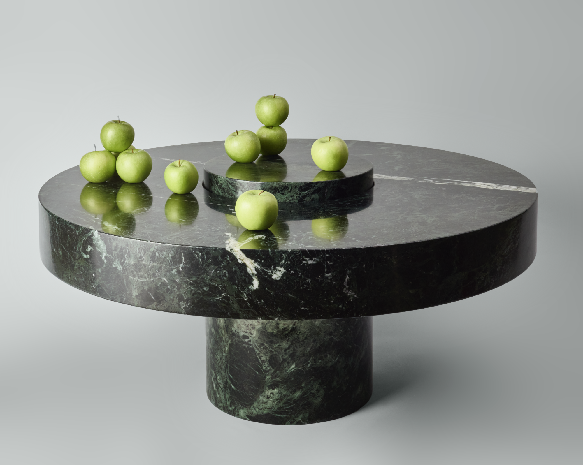 Crafted from Greek Verde Naoussa marble, STACK XL coffee table has a diameter of 104 cm and height of 44 cm. This collaborative project plays with the idea of transforming raw, natural stones into a modulor reversable sculpture.