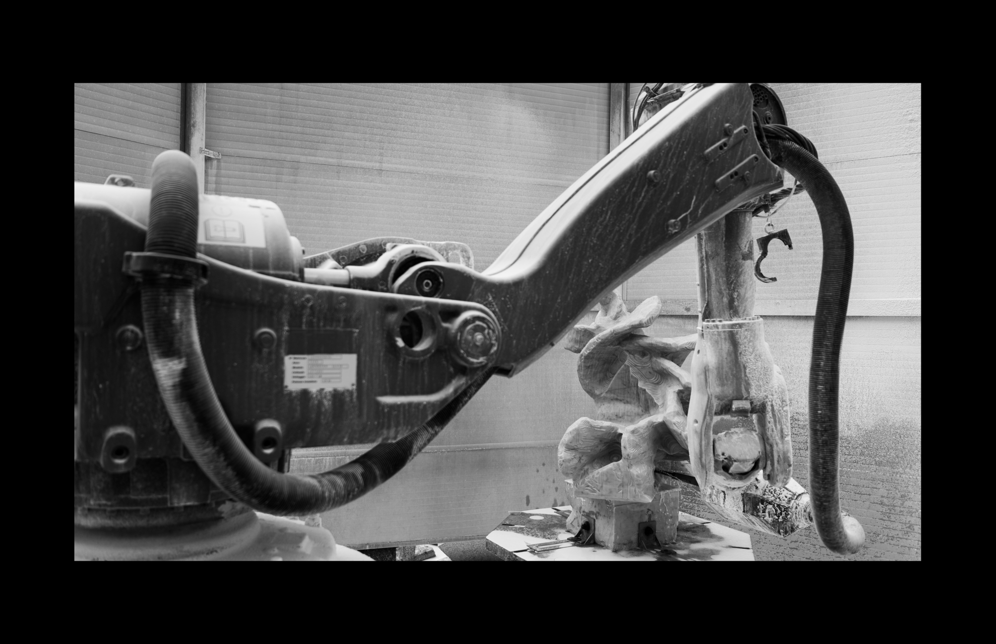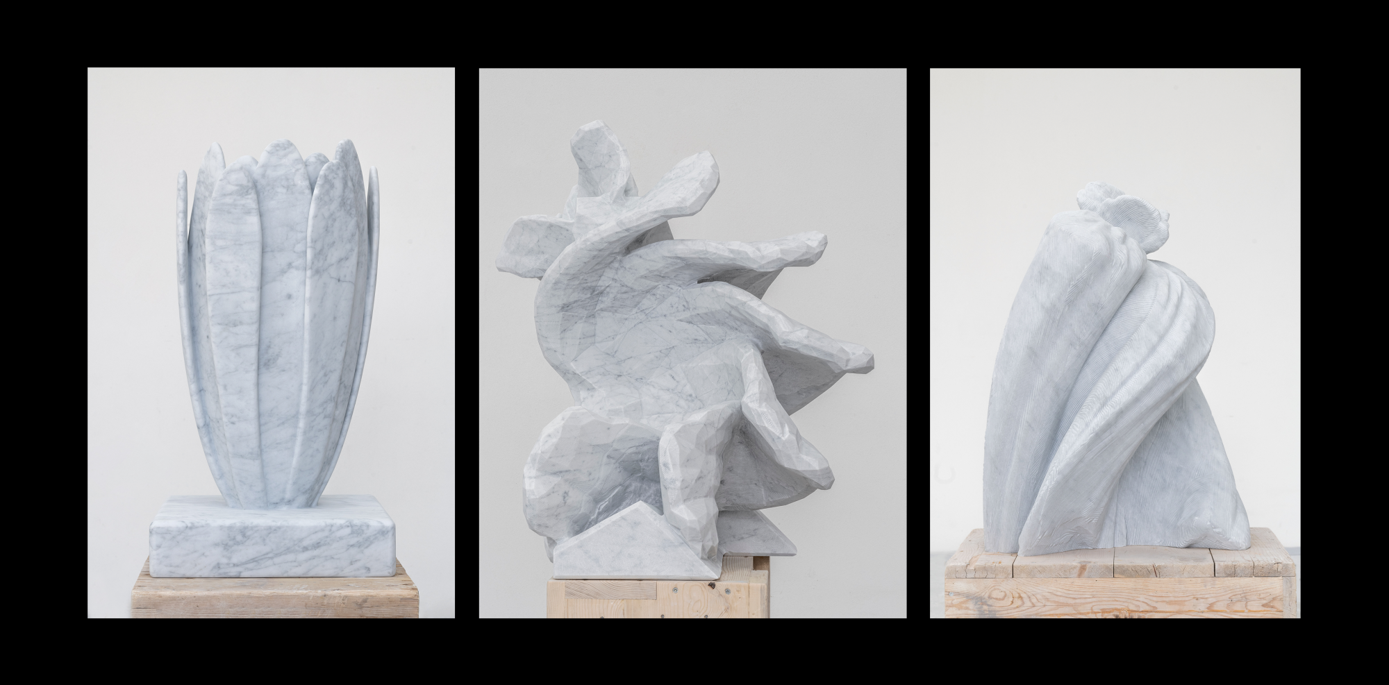 Glitching While Blooming explores the dialogue between human hand, machine, and marble. Robotic tools create irregularities, which the artist shapes into unique surfaces of geometry and texture. The work embraces imperfection, letting process guide the final form.