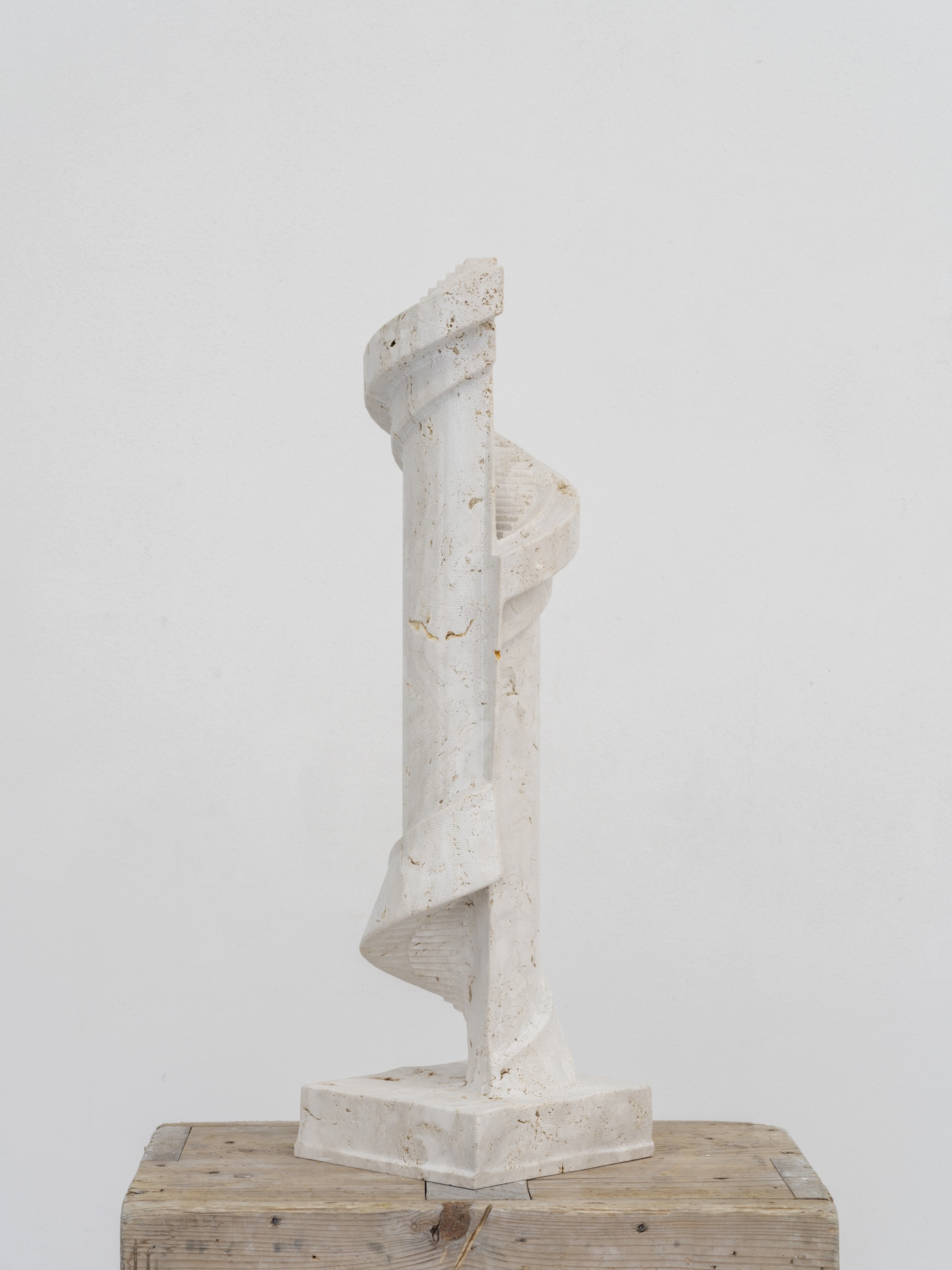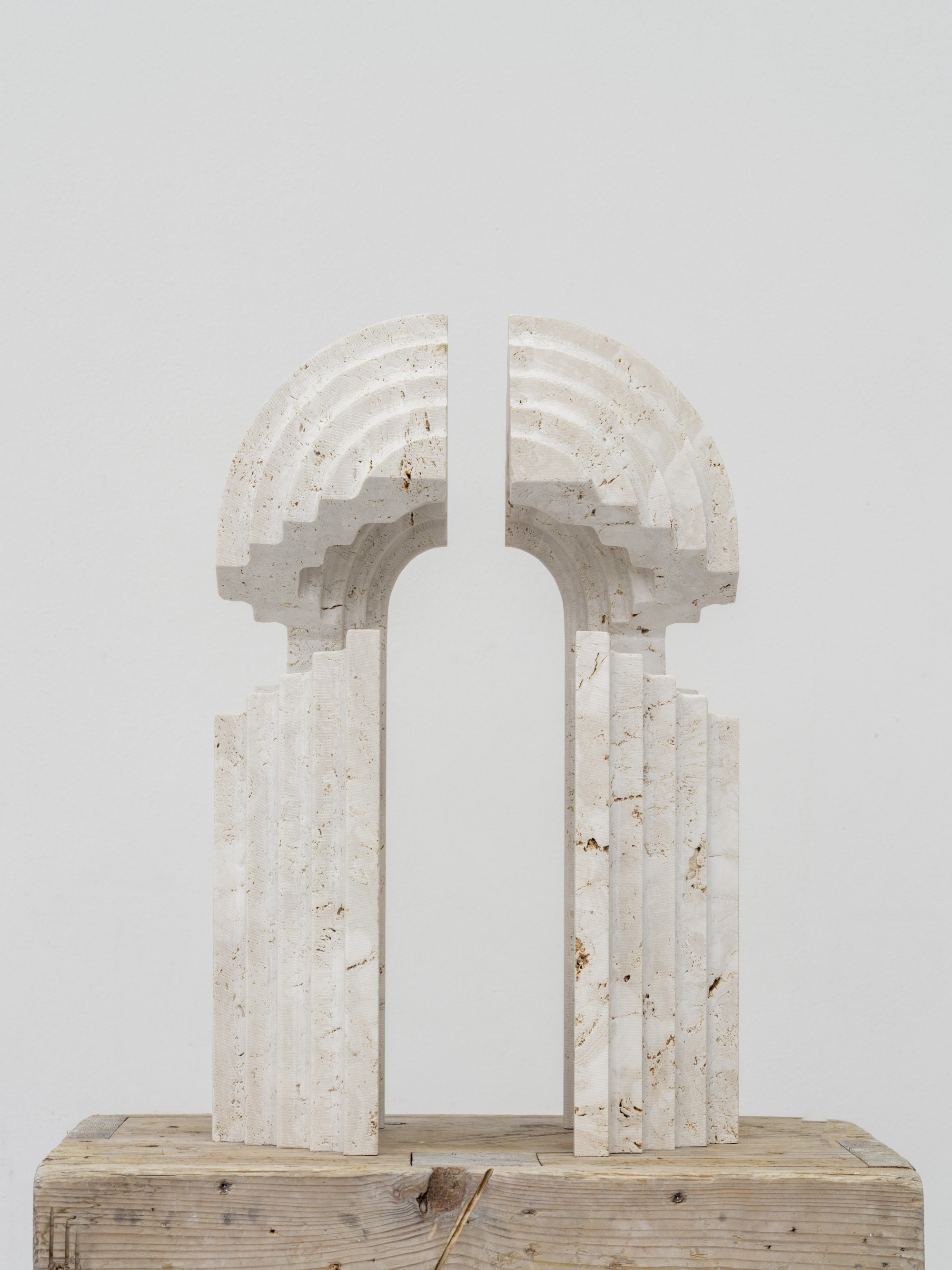 Deliberate imperfections evoke the passage of time, while distorted forms challenge gravity, generating tension between past and future, solidity and movement. Travertine—an emblem of Rome’s architectural legacy—becomes a medium for experimentation, bridging tradition and reinvention. The sculptures invite viewers to experience the city’s history through a radical, visionary lens, where light, shadow, and texture transform classical forms into a contemporary dialogue.